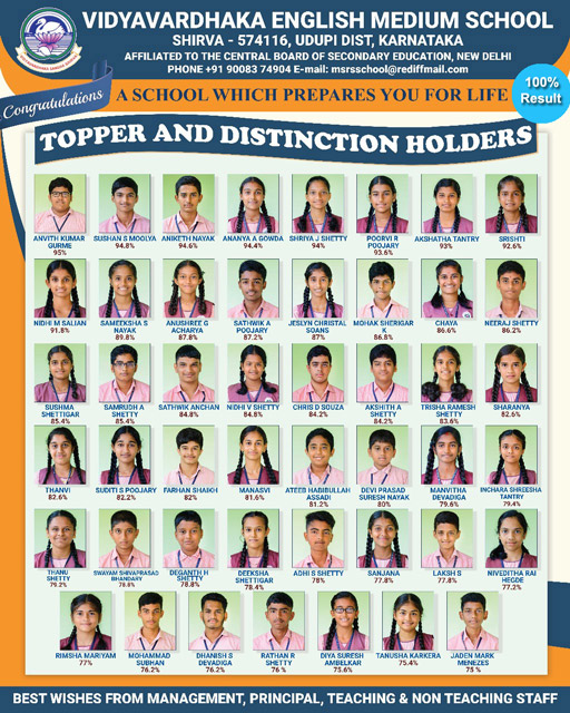 Vidyavardhaka English Medium School is managed by Vidyavardhaka Sangha ® Shirva. The Sangha is headed by Sri. N Vinaya Hegde, Chancellor of NITTE University, a renowned educationalist, administrator and philanthropist. The school managing committee is headed by Sri. Suresh P Shetty, a reputed industrialist and philanthropist.